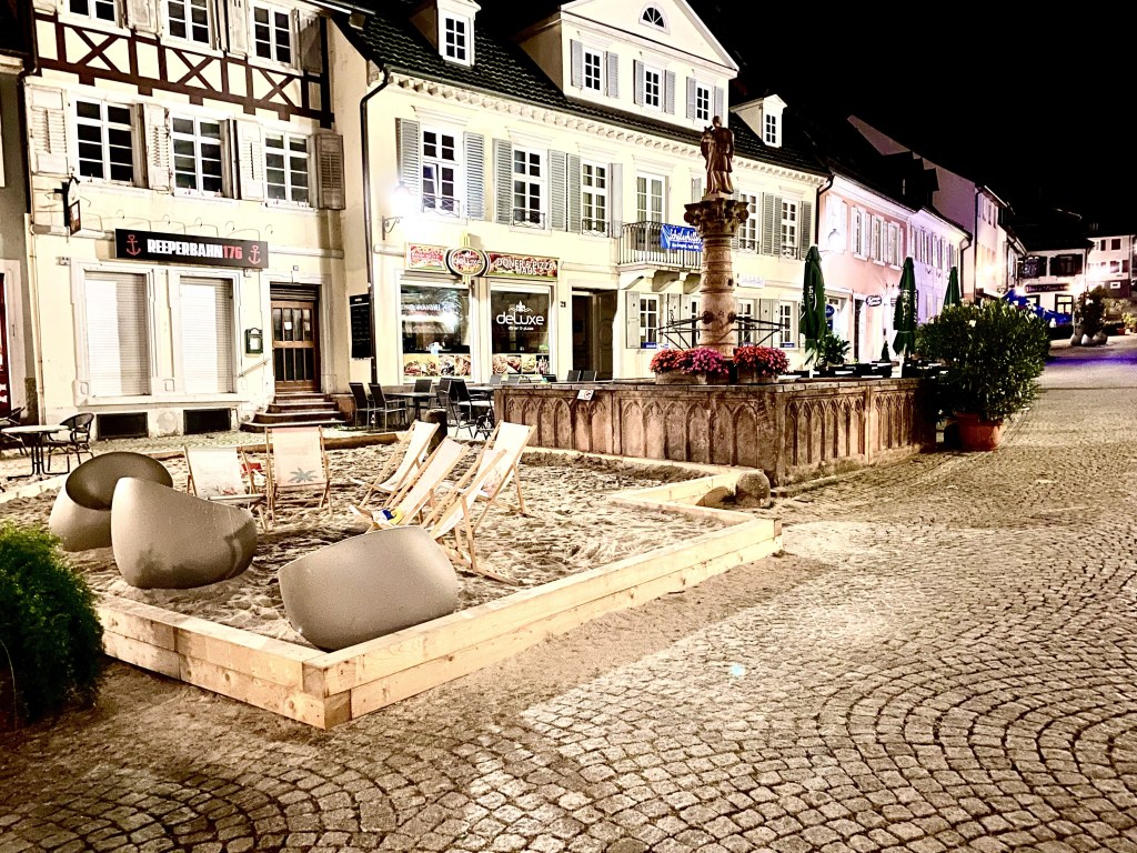 Ein Stadtstrand, Design-Sitzecken als „Möblierung“ der verkehrsberuhigten Hauptstraße. Nun sollen die gastronomischen Außenbereiche noch aus der Verschattung geholt werden und in die badische Sonne gestellt werden. Die Hauptstraße soll umbenannt in „Marktplatz“, Gassen sollen durch Hängeschmuck vertunnelt werden, die Brücke über die Murg soll formensprachlich reduziert und zu einer möblierten Aufenthaltszone verwandelt werden, wiederum mit Sitzinseln und wahlweise mit Blick auf den Verkehr nach und von Baden-Baden oder die Murg und den Wörthgarten. Die zauberhaften Hausfassaden sollen ebenso wie die Brunnen der Stadt inszenierend mit Lichtgestaltung noch verzauberter werden.